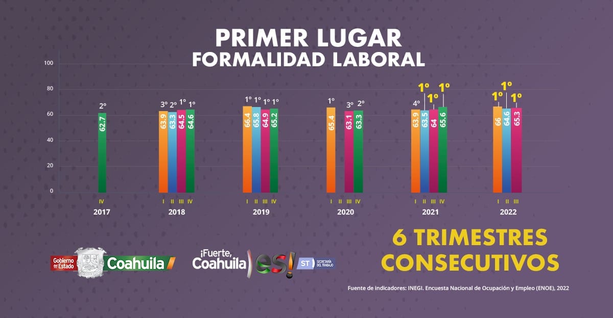 Durante el Gobierno de Miguel Ángel Riquelme Solís, Coahuila ha ocupado el primer lugar en formalidad laboral durante 13 trimestres; sólo al inicio de la Administración el Estado se encontraba en tercero y segundo lugar, y a partir del tercer trimestre de 2018 se colocó en el liderato en este indicador.
