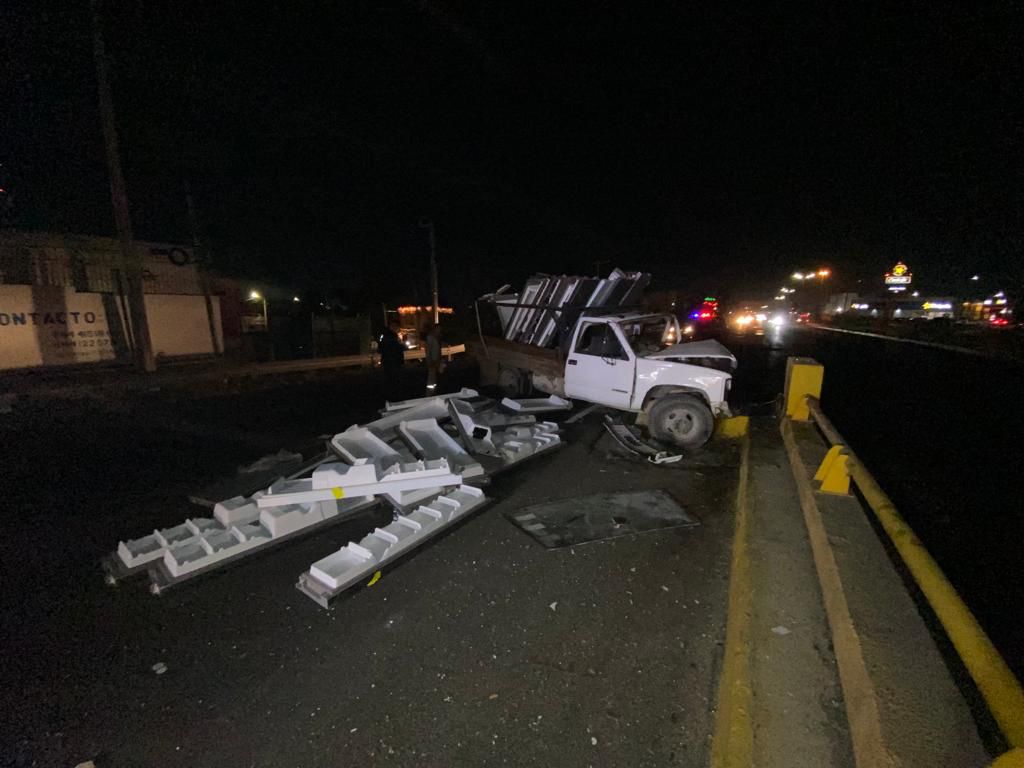 El conductor de un camión de tres y media toneladas, sufrió un accidente cuando circulaba por la Carretera Saltillo-Monterrey, en dirección de norte a sur, al momento en que no decidió a tiempo si subir el puente a la altura de Manuel Acuña, por lo que se impactó de lleno contra la base del puente.