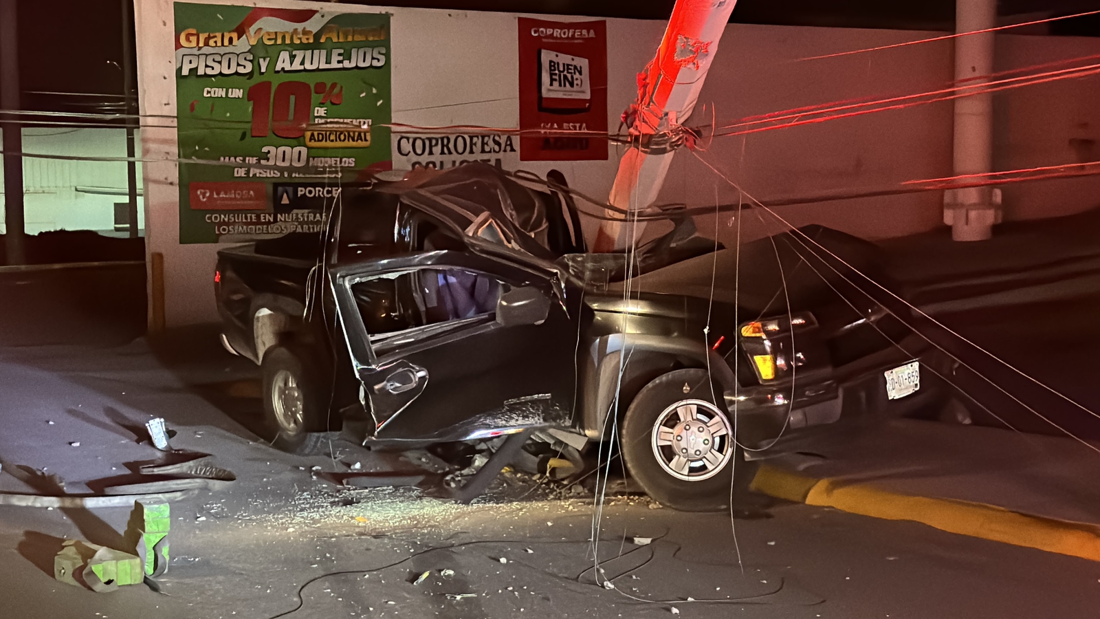 En un trágico accidente, un joven de 19 años perdió la vida de manera casi instantánea cuando se impactó de lleno a muy alta velocidad contra un poste de concreto, el cual derribó cayéndole encima de su camioneta Chevrolet Colorado con placas de Nuevo León.