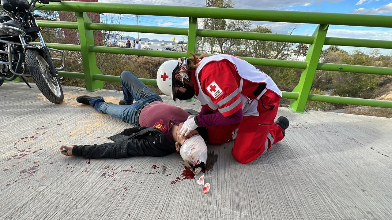 El motociclista resultó subiendo al camellón central y se impactó contra las protecciones metálicas de un puente donde pasa un arroyo, y aunque portaba colocado su casco de seguridad, recibió golpes en el rostro y cabeza que le causaron in importante sangrado, por lo que paramédicos de la Cruz Roja lo atendieron para llevarlo a un hospital.