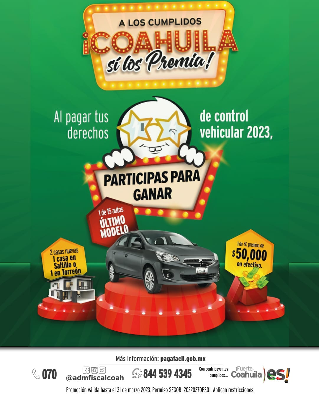 Recuerda que si realizaste tu Prepago 2023 en el mes de diciembre o bien al cubrir tu Control Vehicular 2023 antes del 31 de marzo del año en curso, participas automáticamente en el sorteo “A los cumplidos Coahuila sí los premia”, que consta de increíbles sorpresas, como una de dos casas nuevas en Torreón o Saltillo, uno de 15 autos último modelo o uno de 40 premios de 50,000 pesos.