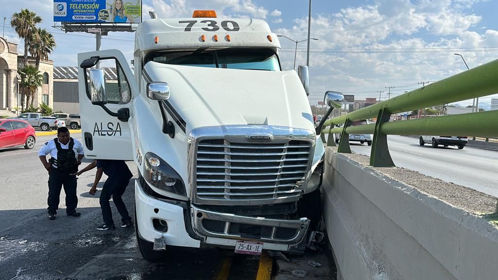Un aparatoso accidente protagonizado por el operador de un tractocamión, se registró durante la tarde de éste jueves al norte de Saltillo, cuando aparentemente intentó esquivar a un vehículo que se le atravesó va a su paso. La maniobra al volante por parte del hombre que conducía la pesada unidad, terminó impactando a una camioneta Hilux, siendo ambos proyectados hacia el muro de concreto del puente campanario; afortunadamente no resultaron personas lesionadas, más que daños materiales.