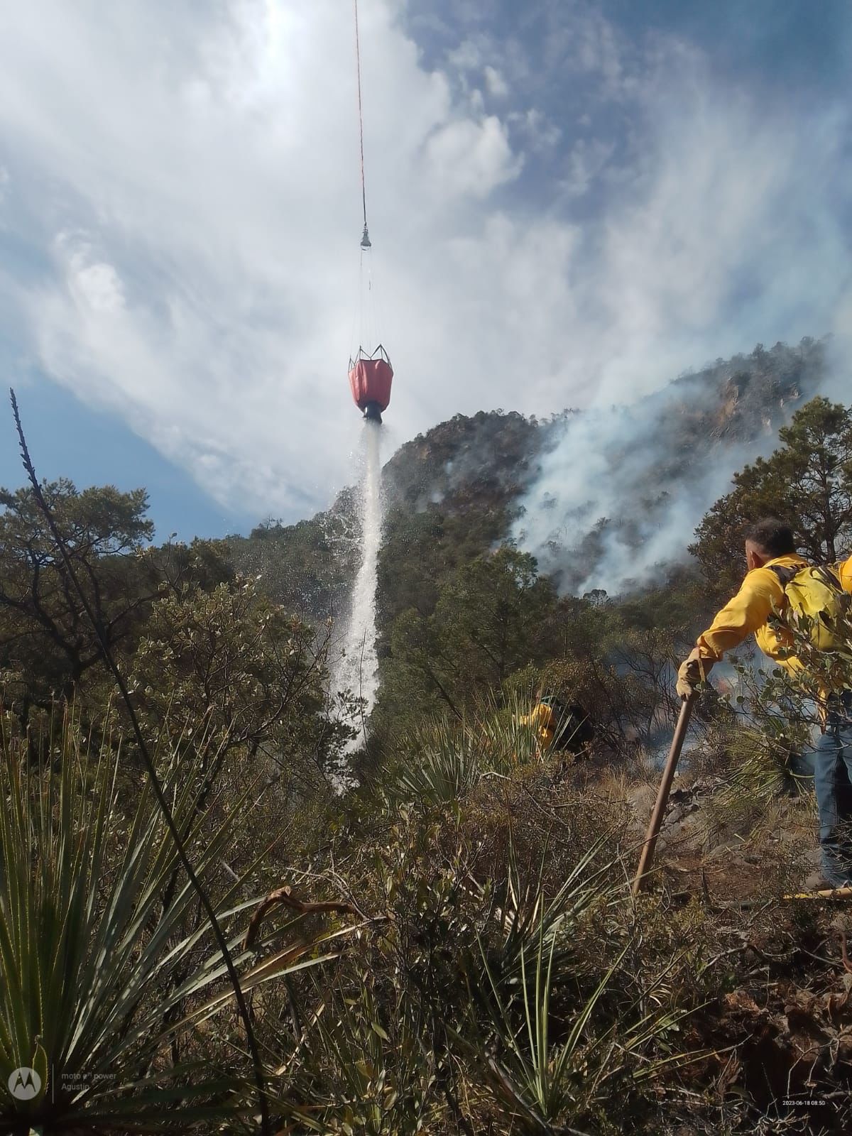 Continúa el apoyo además de dos helicópteros MI de la Fuerza Aérea Mexicana, con matrículas 1717 y 1709, con capacidad de descarga de 2,500 litros de agua en cada viaje, que se emplean para enfriar los puntos más difíciles en los frentes del incendio, donde trabajan los brigadistas en la elaboración de las brechas cortafuegos.