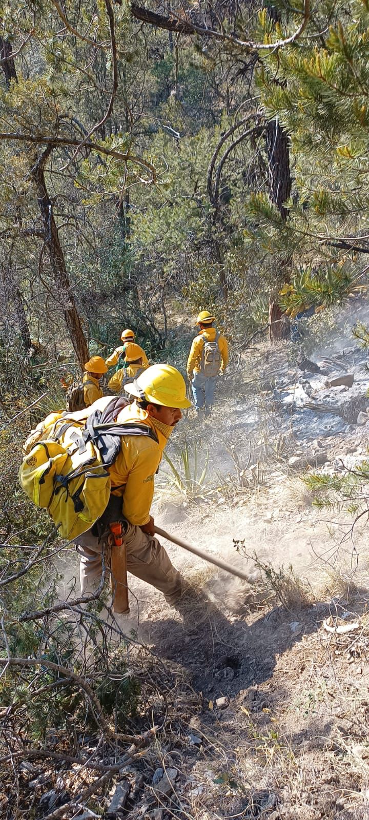 Continuaron las condiciones meteorológicas extremas durante toda la jornada, temperaturas superiores a 38 grados centígrados y humedad relativa menor de 19 por ciento, además de lo complicado de la pendiente del sitio, lo que dificulta las labores de combate y liquidación por parte de los 107 brigadistas asignados al incendio.