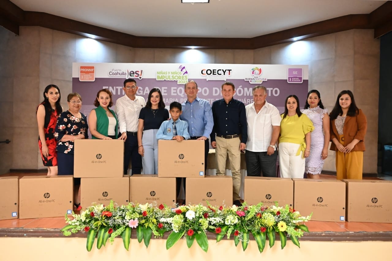 San Buenaventura, Coahuila de Zaragoza; a 29 de junio de 2023.- Dando cumplimiento con el compromiso del gobernador Miguel Ángel Riquelme Solís, la titular de la Procuraduría para Niños, Niñas y la Familia del Estado (PRONNIF), María Leticia Sánchez Campos; el Secretario de Educación, Francisco Saracho Navarro, y el Director General del Consejo Estatal de Ciencia y Tecnología del Estado de Coahuila (COECYT), Mario Prudencio Valdés Garza, hicieron la entrega del Centro de Cómputo a la Escuela Primaria “Presidente Benito Juárez”, por la participación del Niño Impulsor René Eliam, ganador del primer lugar de la Edición 2023.
