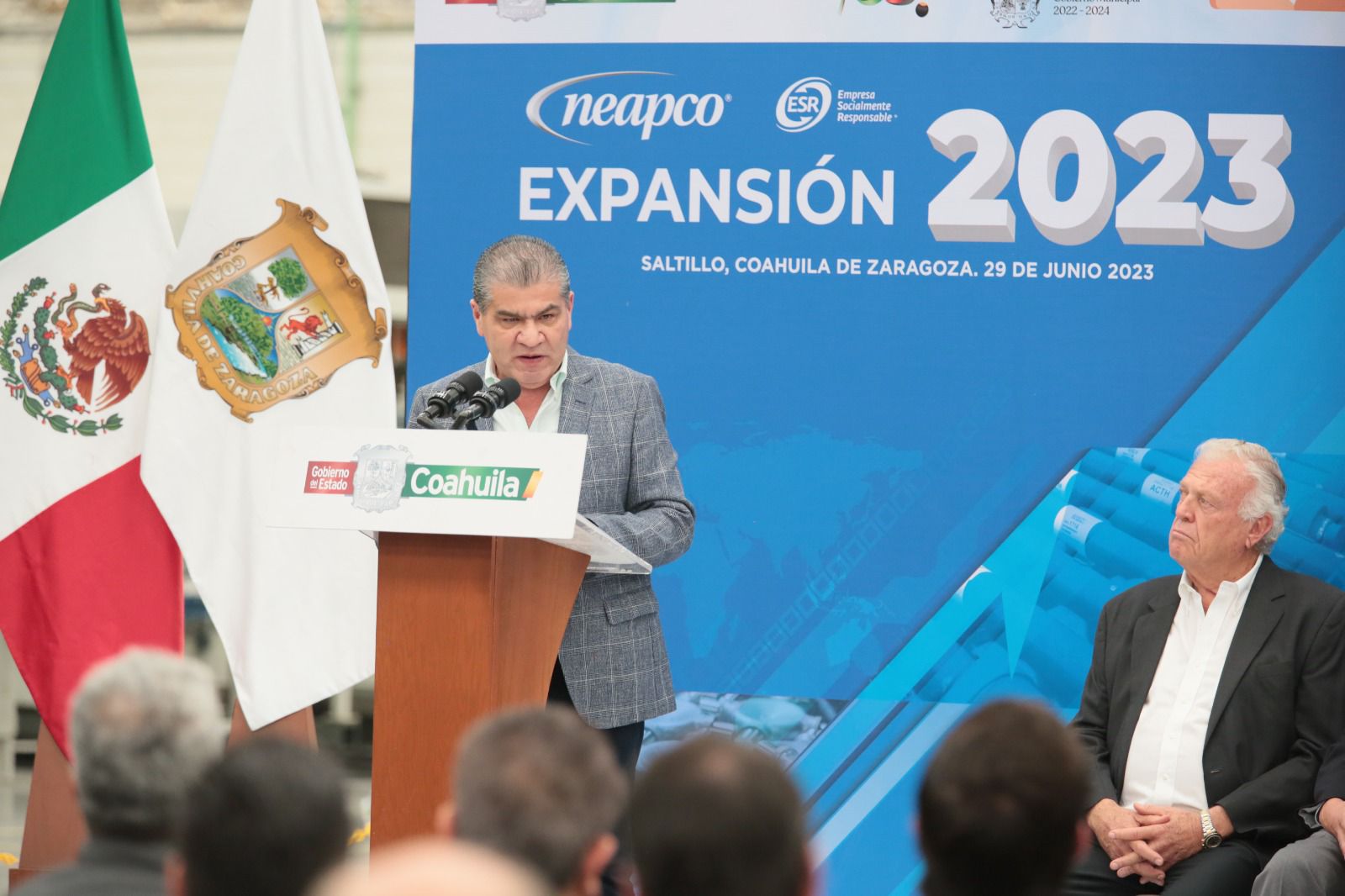 Saltillo, Coahuila de Zaragoza; a 29 de Junio de 2023.- El gobernador Miguel Ángel Riquelme Solís y el alcalde José María Fraustro Siller anunciaron el proyecto de expansión de la empresa NEAPCO, el número 44 en el primer semestre del año en la entidad, y en cual invertirán 59 millones de dólares, que generará 150 empleos directos.