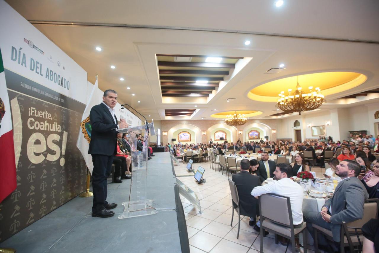 Con la presencia del magistrado Miguel Felipe Mery Ayup, Presidente del Tribunal Superior de Justicia del Estado, así como del Fiscal General, Gerardo Márquez Guevara, y de representantes del Congreso Local, el Mandatario estatal feliz a las tres abogadas y al abogado que hoy recibieron un reconocimiento por su trayectoria de parte de la Asociación de Licenciadas en Derecho y Abogados del Estado de Coahuila, y con ellos a todos los profesionales del Derecho en la entidad.