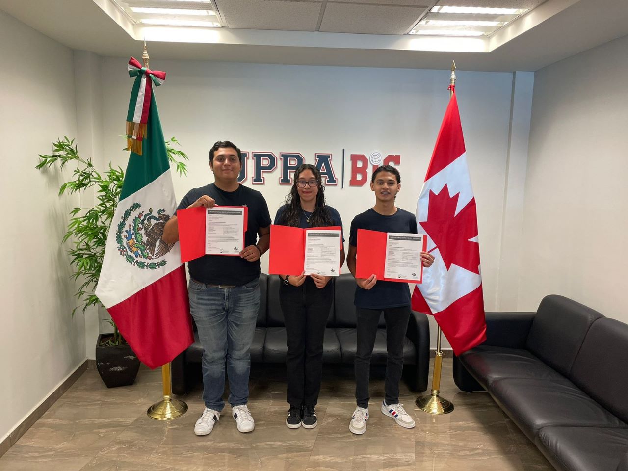 Los alumnos seleccionados son Alondra Joseline Vargas López, de 8° cuatrimestre de la Licenciatura en Administración y Gestión Empresarial (va al Canadore College); Gerardo de Jesús Veloz Cortés, de 8° cuatrimestre de la Licenciatura en Administración y Gestión Empresarial (al Canadore College), y Alejandro Cisneros Álvarez, de 8° cuatrimestre de la Igeniería en Tecnologías de Manufactura (al Centennial College).