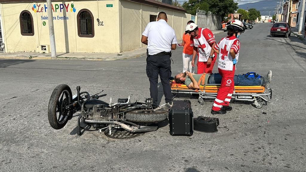 Con las costillas fracturadas resultó un motociclista que sufrió un accidente esta tarde de martes, luego que chocara contra el costado de un automóvil compacto Chevy que se pasó el alto en el cruce de las calles Ildefonso Villarello y Corona en colonia Urdiñola. Paramédicos de la Cruz al atenderlo, lo trasladaron a la clínica del ISSSTE para atender sus lesiones, mientras que el responsable tuvo que ser detenido por elementos de la policía municipal, por las lesiones que provocó.