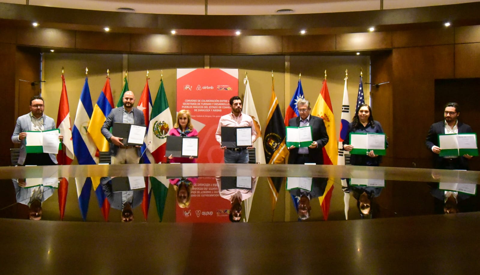 Ante funcionarios estatales y representantes de la cadena de valor de toda la entidad, signaron el convenio la titular de SECTUR Coahuila, Azucena Ramos Ramos; Sebastián Colín Ávila, Director de Asuntos Públicos de AIRBNB para México, y Eduardo Valdez, asesor de AIRBNB.