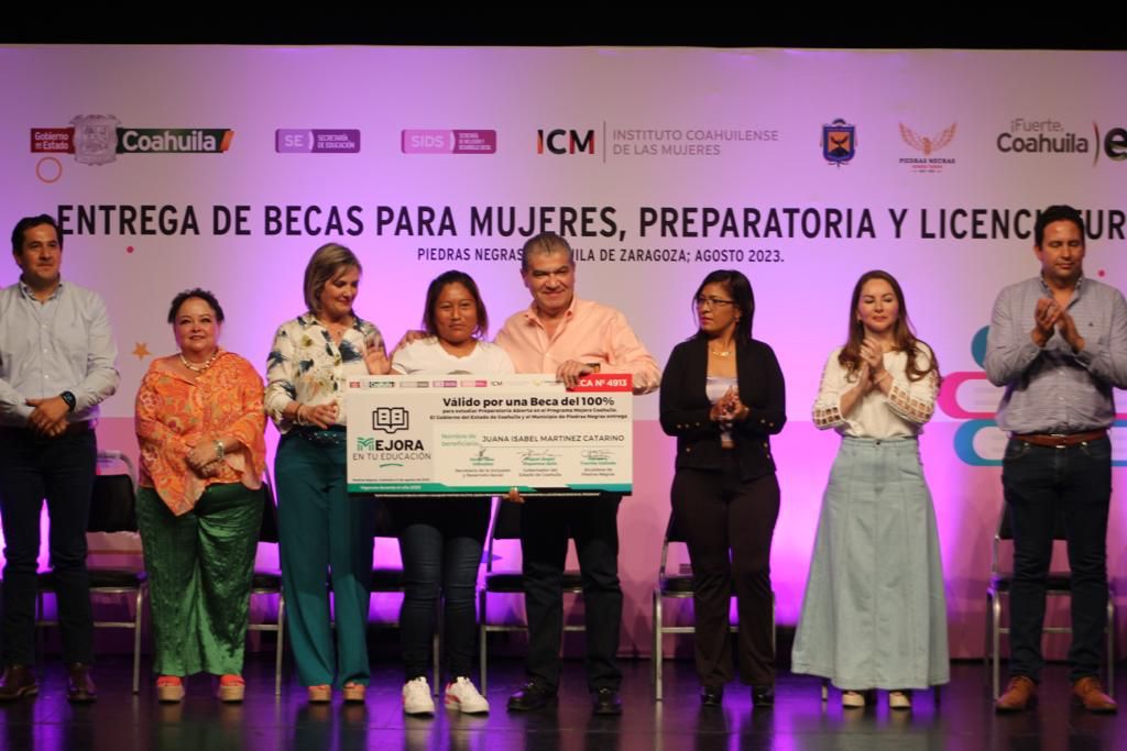 Posteriormente, en el Teatro de la Ciudad “José Manuel Maldonado”, el gobernador Miguel Riquelme hizo entrega de un total de 1,076 becas a alumnas de la primera generación de estudios universitarios, y segunda generación de preparatoria abierta, con recursos por 8 millones 600 mil pesos