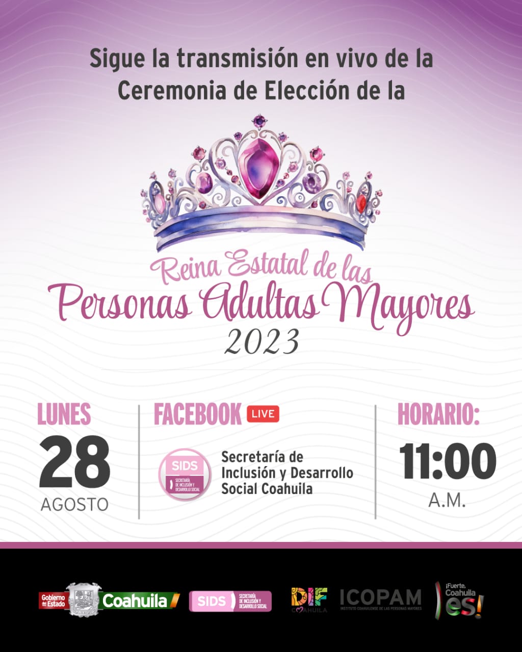 Saltillo, Coahuila de Zaragoza; a 26 de Agosto de 2023.- La Secretaría de Inclusión y Desarrollo Social del Estado (SIDS) te invita a seguir la transmisión en vivo de la ceremonia de elección de la Reina Estatal de las Personas Adultas Mayores este lunes 28 de agosto a través de su Facebook.