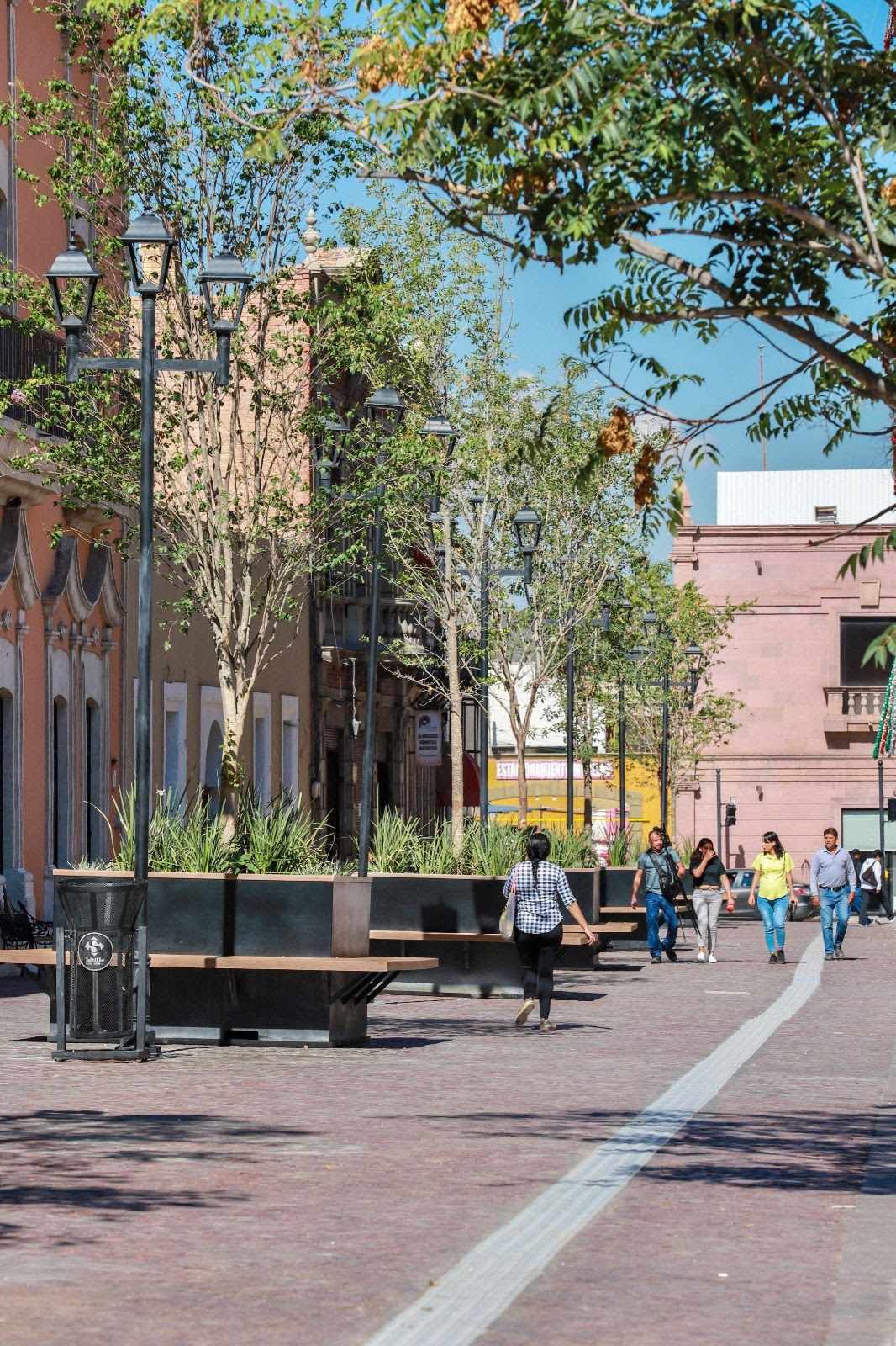 En el Paseo Capital, que cuenta con piso rústico para dar la apariencia antigua, se instalaron bancas, arbolado y jardineras, además de construirse una línea tactopodal para facilitar el tránsito de personas invidentes.