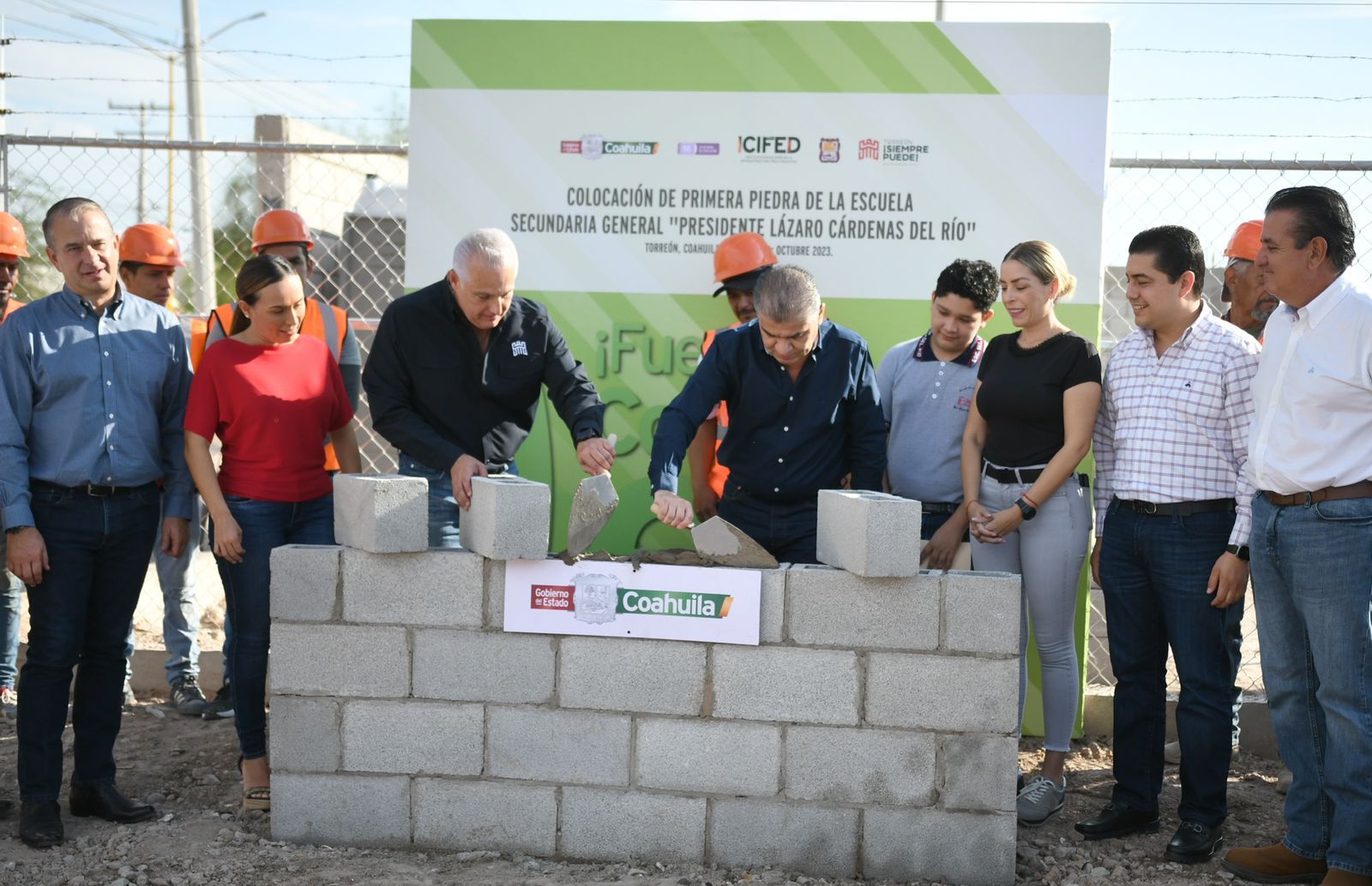 Torreón, Coahuila de Zaragoza; a 2 de Octubre de 2023.- El gobernador Miguel Ángel Riquelme Solís, acompañado por Román Alberto Cepeda González, Alcalde de Torreón,  colocó la primera piedra de la Escuela Secundaria General “Presidente Lázaro Cárdenas del Río”, en la que se invertirán 10.4 millones de pesos.