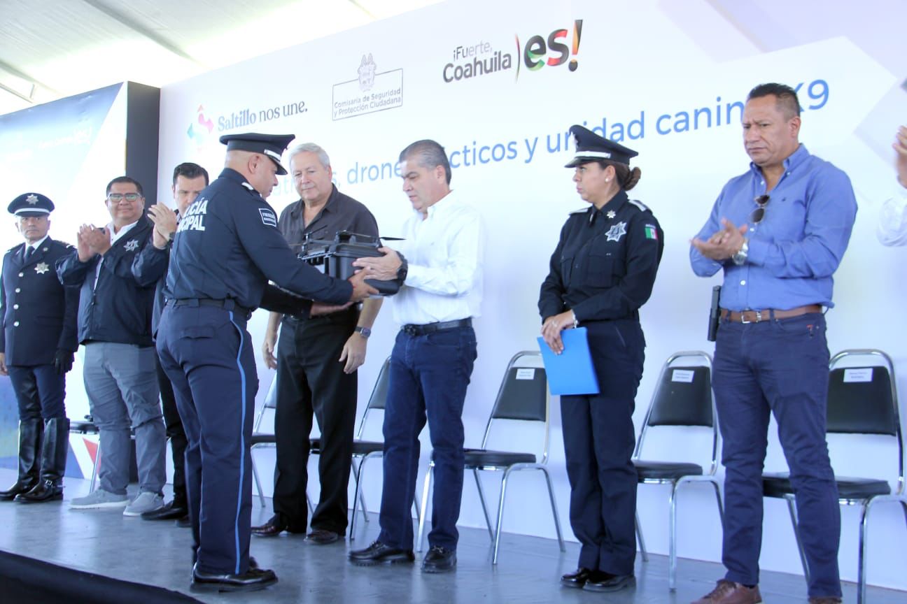 El Mandatario estatal entregó, junto al Alcalde de Saltillo, José María Fraustro Siller, 10 patrullas totalmente equipadas, dos drones tácticos y un elemento canino (de la raza pastor belga), al grupo K-9 de la Comisaria de Seguridad y Participación Ciudadana de Saltillo.