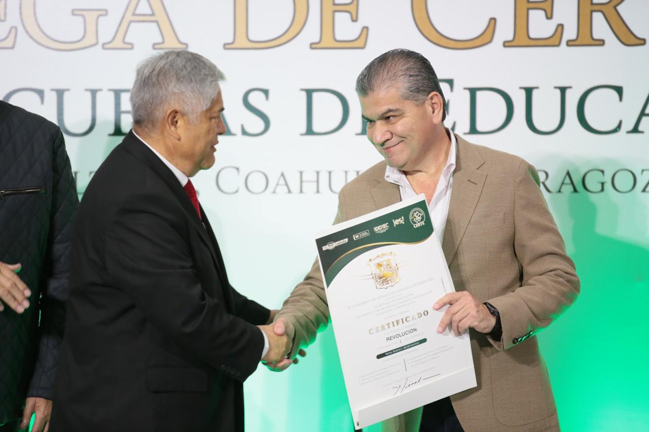 Acompañado por José María Fraustro Siller, Alcalde de Saltillo; y por Francisco Saracho Navarro, Secretario de Educación, así como por los líderes sindicales de las secciones 5 y 38 del SNTE, en este evento el Mandatario estatal entregó su certificación a 75 escuelas: 36 de la Región Norte, 7 de la Carbonífera y 32 de la Sureste. La próxima semana se estará entregando al resto de las escuelas de las regiones Laguna y Desierto.