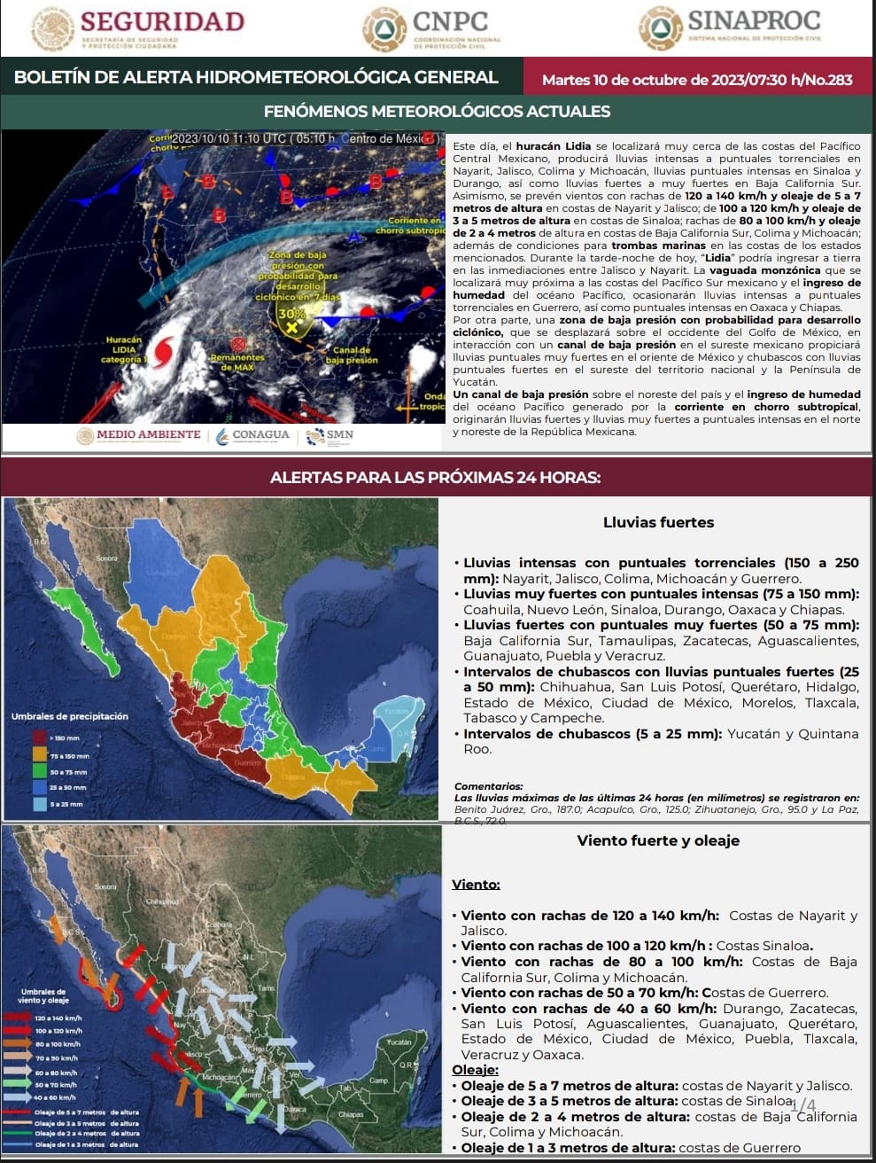 Saltillo, Coahuila de Zaragoza; a 10 de Octubre de 2023.- La Subsecretaría de Protección Civil del Estado (PC) informó que este día el Huracán “Lidia” se localizará muy cerca de las costas del Pacífico Central Mexicano, propiciando lluvias muy fuertes a puntuales intensas en Coahuila, principalmente en las regiones Laguna y Sureste.