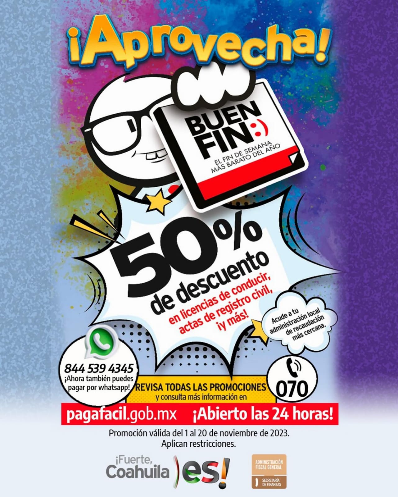 Saltillo, Coahuila de Zaragoza; a 6 de Noviembre de 2023.- El Gobierno del Estado, a través de la Administración Fiscal General (AFG), invita a las y los coahuilenses a aprovechar el Buen Fin 2023, que estará disponible del 1 al 20 de noviembre del 2023.