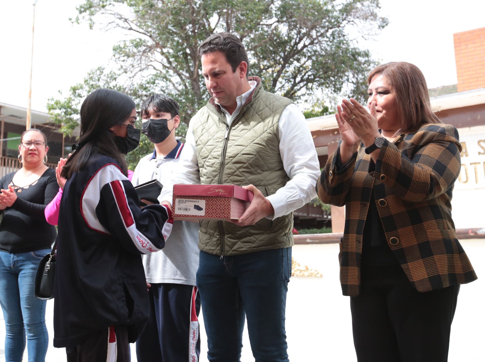 El titular de la SIDS, Javier Díaz González, junto al Director de Proyectos Educativos de la Secretaría de Educación, Óscar de León Flores, entregó el calzado a alumnos del Jardín de Niños “Narcizo Mendoza”, de la Colonia Puerto de la Virgen, ya estudiantes de la Secundaria General Número 5, del sector de La Minita, en sus turnos matutino y vespertino.