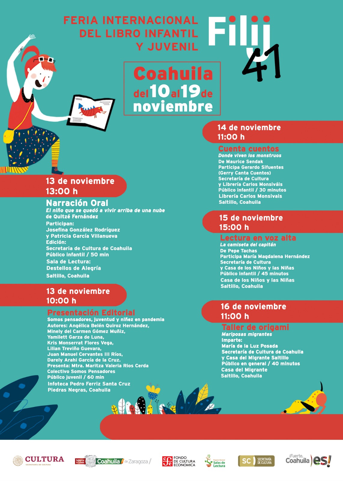Saltillo, Coahuila de Zaragoza; a 11 de Noviembre de 2023.- El Gobierno de Coahuila, a través de su Secretaría de Cultura y en colaboración con el Fondo de Cultura Económica, invitan a la comunidad a participar en las actividades que se tendrán con motivo de la 41 Feria Internacional de Libro Infantil y Juvenil (FILIJ), que se llevará a cabo del 13 al 16 de noviembre en diversas salas de lectura de nuestro estado.