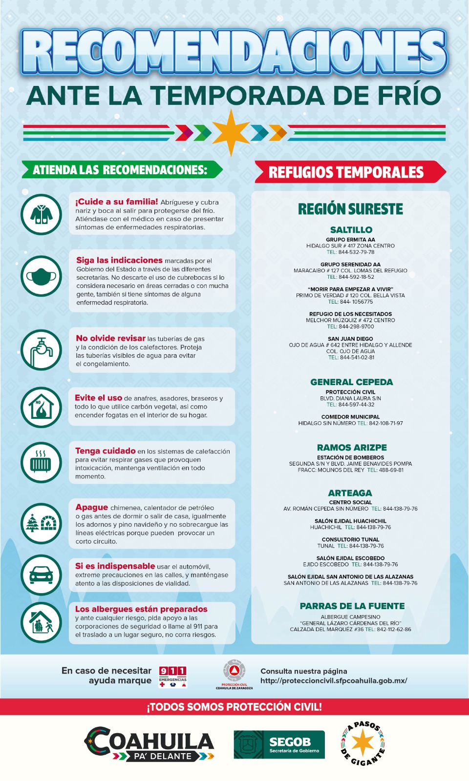 Así mismo, se emiten recomendaciones para evitar riesgos en el interior de los domicilios, como evitar el uso de anafres o encender carbón, leña y gas como fuentes de calefacción en interiores sin contar con la ventilación adecuada; en caso de no contar con calentones, evitar la entrada de aire frío a la vivienda y abrigarse de manera adecuada y suficiente; consumir líquidos calientes y alimentos ricos en carbohidratos y vitamina C; evitar la recarga de las instalaciones eléctricas domiciliarias, además de mantenerse informado de los reportes que emita Protección Civil del Estado y de las ubicaciones de los refugios temporales en la página web http://proteccioncivil.sfpcoahuila.gob.mx/modulo22.php?opcion=8.