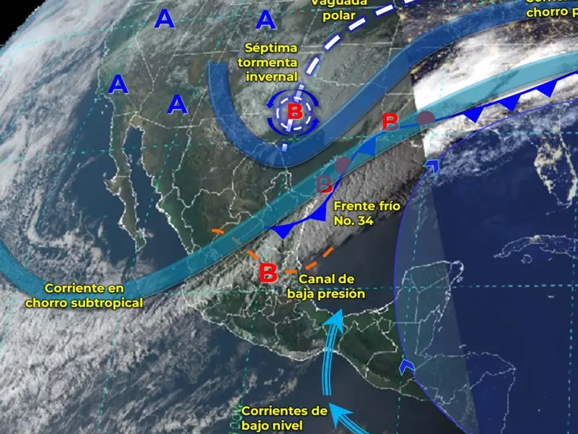 El frente frío 34 avanzará rápidamente sobre el litoral del Golfo de México e interaccionará con la corriente en chorro subtropical, originando lluvias muy fuertes. La masa de aire polar asociada al frente originará evento de “Norte” en el litoral del Golfo de México, la Península de Yucatán, además del Istmo y Golfo de Tehuantepec.