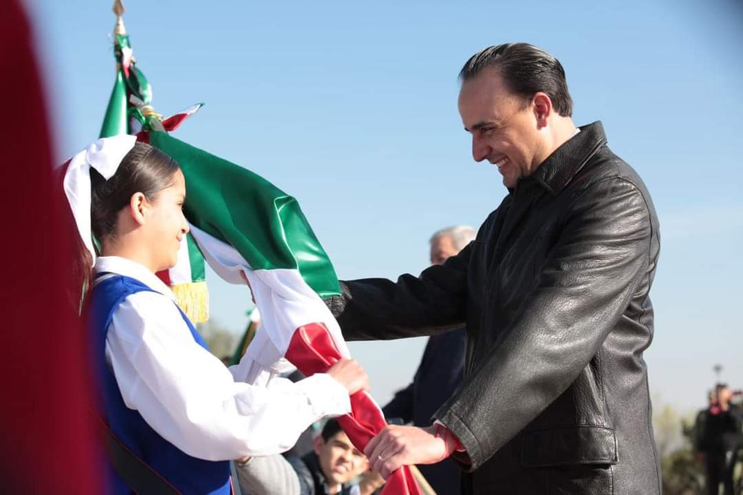 Saltillo, Coahuila de Zaragoza; a 24 de febrero de 2024.- El gobernador Manolo Jiménez Salinas encabezó la ceremonia de conmemoración del Día de la Bandera, acto que se llevó a cabo en la explanada del Parque Las Maravillas y a la que asistieron escoltas de escuelas de nivel básico, “es un orgullo y un honor estar con ustedes, el haber entregado nuestra bandera a quienes son el presente y el futuro de Coahuila”, mencionó.