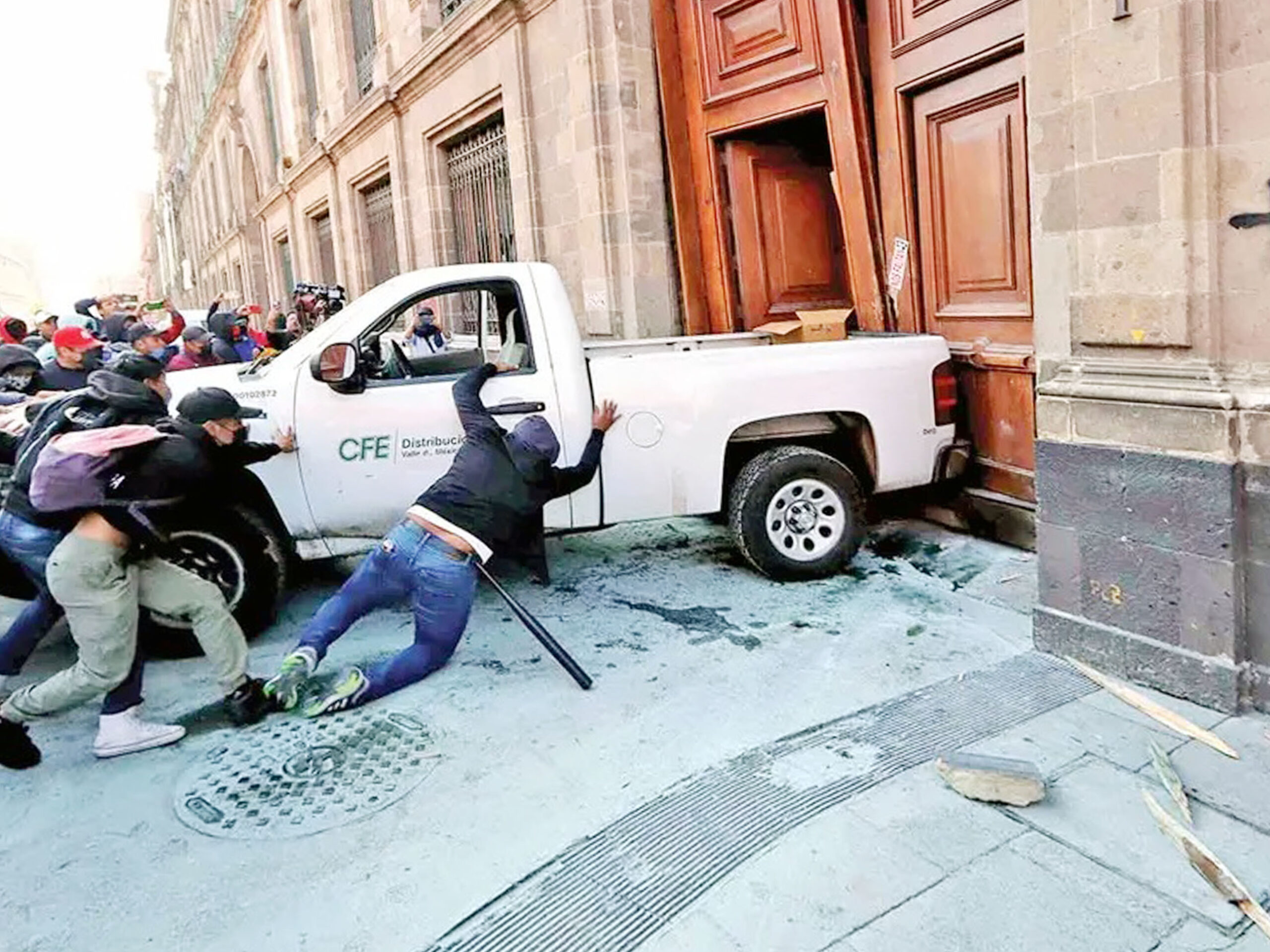 Al no lograrlo, usaron como ariete una camioneta tipo pick up blanca, de la CFE, con la que destrozaron parte de la puerta, sin lograr derribarla totalmente.