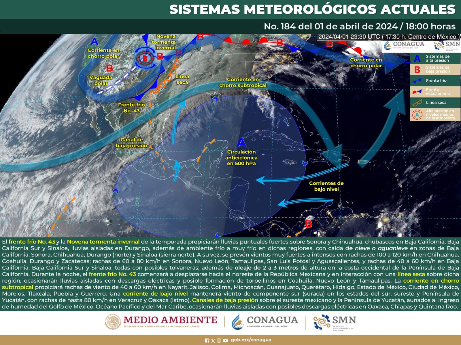 El Servicio Meteorológico Nacional prevé temperaturas mínimas de 0 a 5 °C, lo que podría generar heladas en las zonas elevadas del estado. Además, se esperan lluvias aisladas (de 0.1 a 5 mm), vientos de muy fuertes a intensos con rachas de 100 a 120 km/h y tolvaneras.
