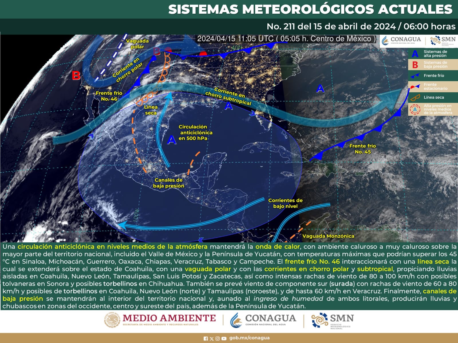Por otro lado, el frente frío No. 46 se extenderá sobre el norte de México e interactuará con una línea seca, la cual se extenderá sobre el estado de Coahuila. Esto, junto con una vaguada polar y las corrientes en chorro polar y subtropical, propiciará lluvias aisladas con viento del componente sur (surada), con rachas de viento de 60 a 80 km/h y posibles torbellinos en Coahuila.