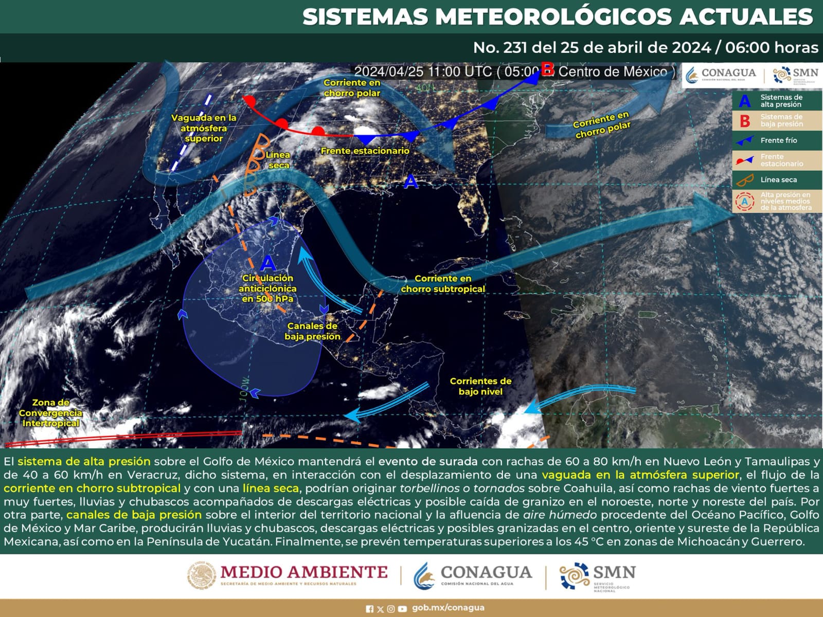 Según el Servicio Meteorológico Nacional, se esperan temperaturas elevadas de hasta 40°C y se prevén intervalos de chubascos que podrían acumular de 5 a 25 mm de lluvia, así como viento con rachas de 60 a 70 km/h con tolvaneras y posible formación de torbellinos o tornados en las regiones norte y carbonífera de Coahuila.
