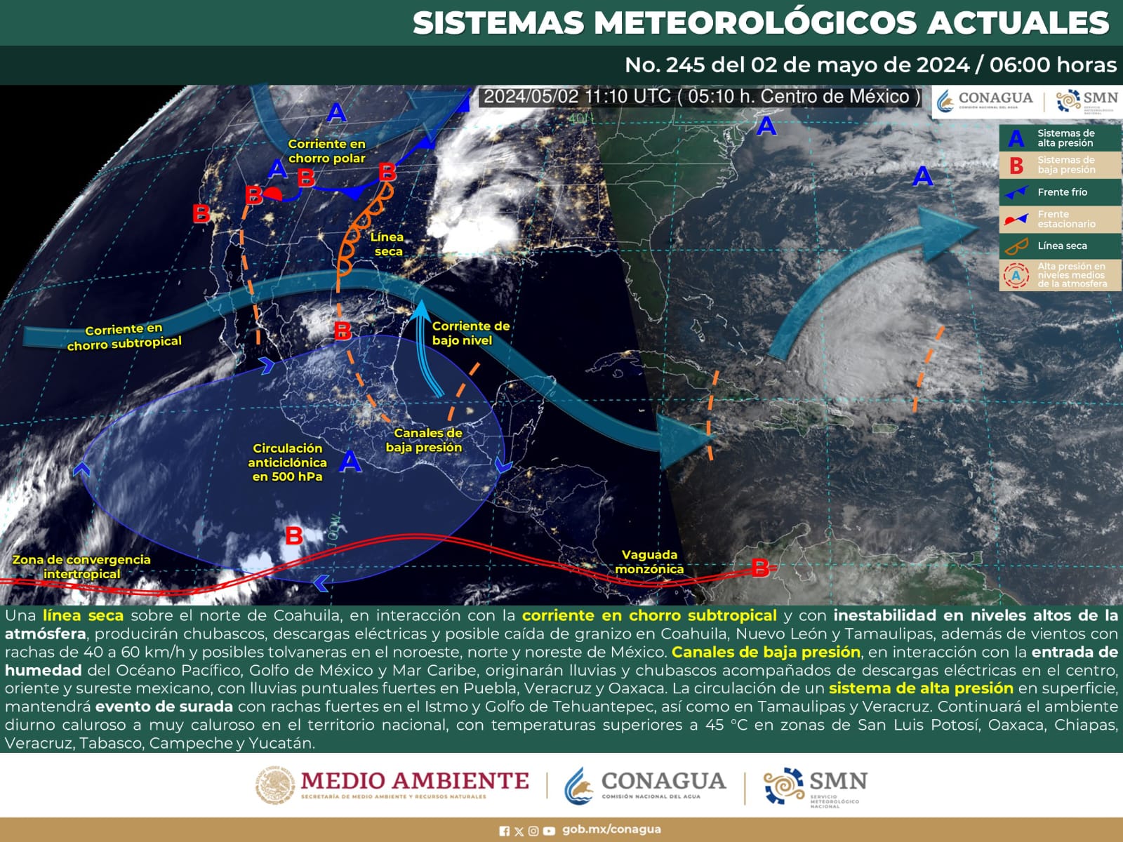 El Servicio Meteorológico Nacional anticipa temperaturas máximas de entre 35 y 40°C, con chubascos que podrían acumular entre 5 y 25 mm de lluvia. También se espera que los vientos alcancen ráfagas de 40 a 60 km/hy puedan generar tolvaneras, especialmente en las regiones norte y carbonífera de Coahuila.