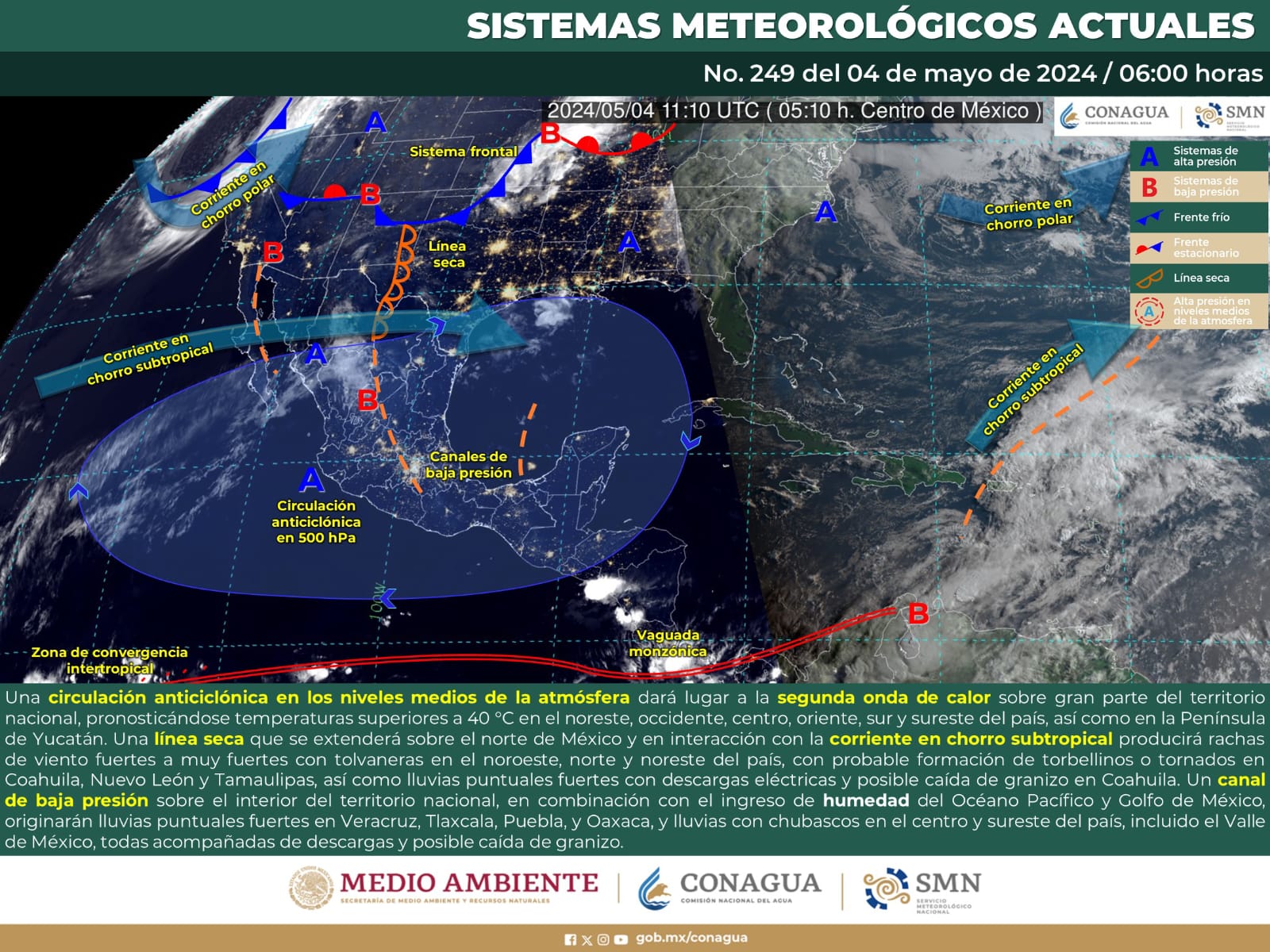 Saltillo, Coahuila de Zaragoza; a 4 de mayo de 2024.- La Subsecretaría de Protección Civil del Estado (PC) informó que, hoy sábado, una circulación anticiclónica en los niveles medios de la atmósfera dará lugar a la segunda onda de calor sobre gran parte del territorio nacional, pronosticándose Temperaturas superiores a 40 °C. Por otra parte, una línea seca que se extenderá sobre el norte de México y en interacción con la corriente en chorro subtropical producirá rachas de viento fuertes a muy fuertes, con probable formación de torbellinos o tornados en Coahuila, así como lluvias puntuales fuertes con descargas. eléctrica y posible caída de granizo.