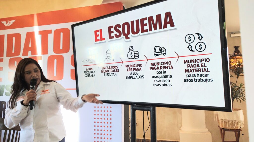 «(Efrén y Jacobo) se convirtieron en factureros. Si alguien te da una factura no te lo da sin nada a cambio, entonces la familia Rodríguez hizo componendas con la alcaldesa, triangulación de dinero, donde Jacobo Rodríguez le regresa dinero; el porcentaje, yo tengo entendido, es el 10 por ciento de todo este robo (…). Hasta el 2022 a los dos meses del 2023, lo que yo llevaba contabilizado son 35 millones para la empresa Aikin», dijo en rueda de prensa.