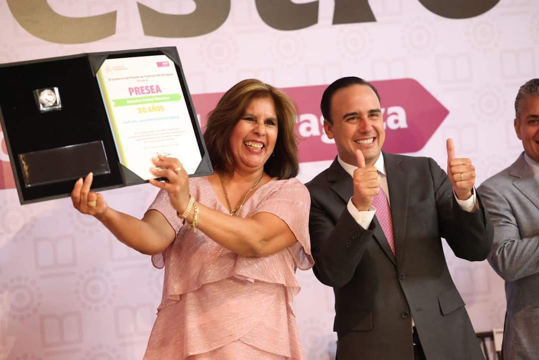 «Iniciamos los festejos del día del Maestro con la entrega de reconocimientos a más de 350 maestros y maestras que forman parte de la sección 5ta, de todas las regiones de Coahuila que llevan 30, 40 y 50 años de trayectoria y un gran compromiso con el desarrollo de nuestros niños, niñas, adolescentes y jóvenes. La educación es una prioridad para nuestro gobierno y juntos la llevaremos al siguiente nivel. Gracias por formar a muchas generaciones de coahuilenses echados pa’ delante», destacó el gobernador.