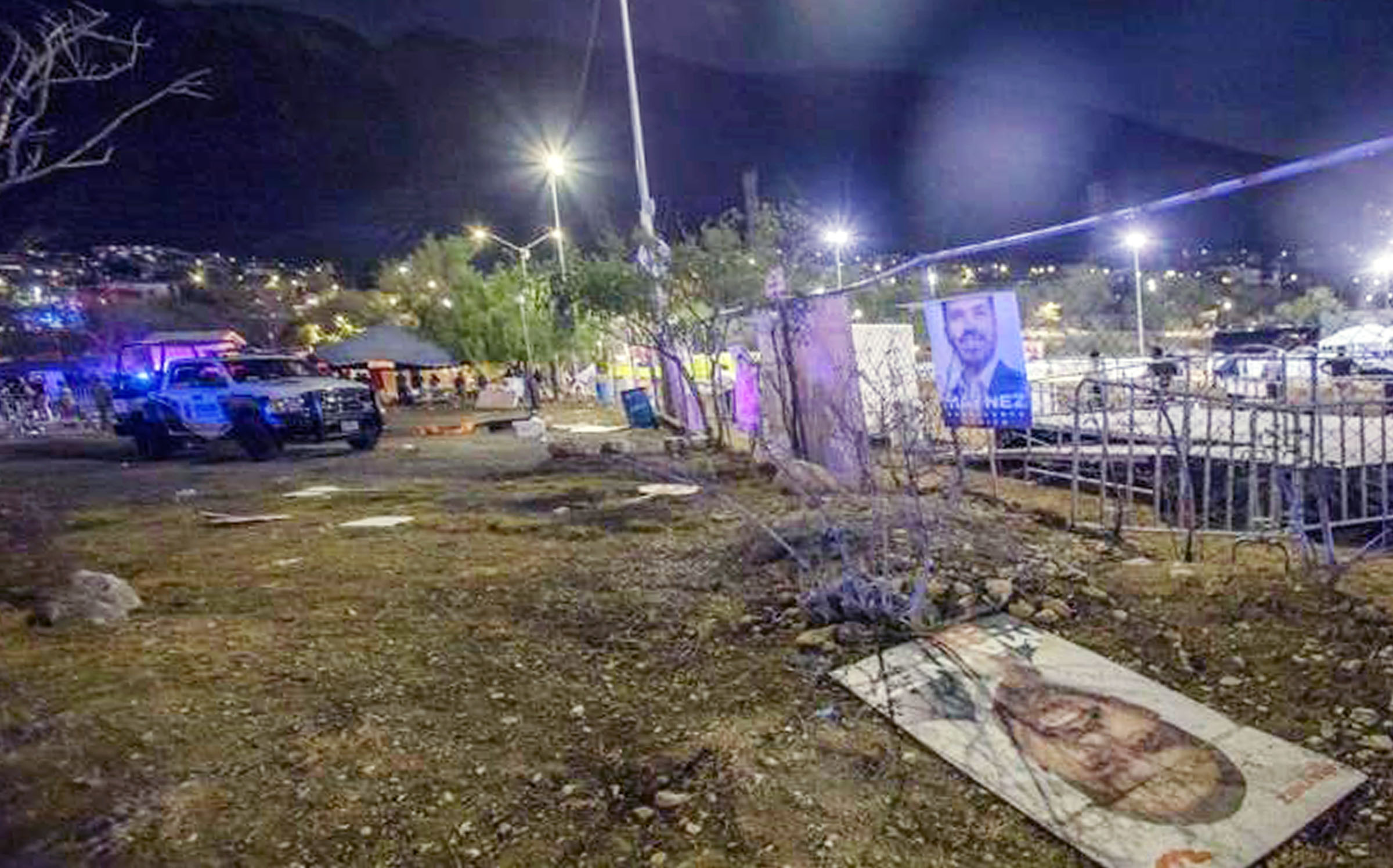 Las autoridades resguardan el sitio, donde permanecen vestigios del evento proselitista como banderas y pancartas de color naranja, relativo a MC, así como calzado de la gente que salió en estampida y ropa ensangrentada.
