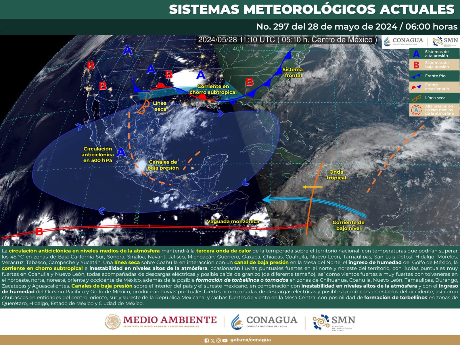 Simultáneamente, una línea seca sobre Coahuila, en combinación con un canal de baja presión en la Mesa del Norte, generará lluvias muy fuertes en el estado, acompañadas de descargas eléctricas, potencial caída de granizo de varios tamaños, y vientos intensos.