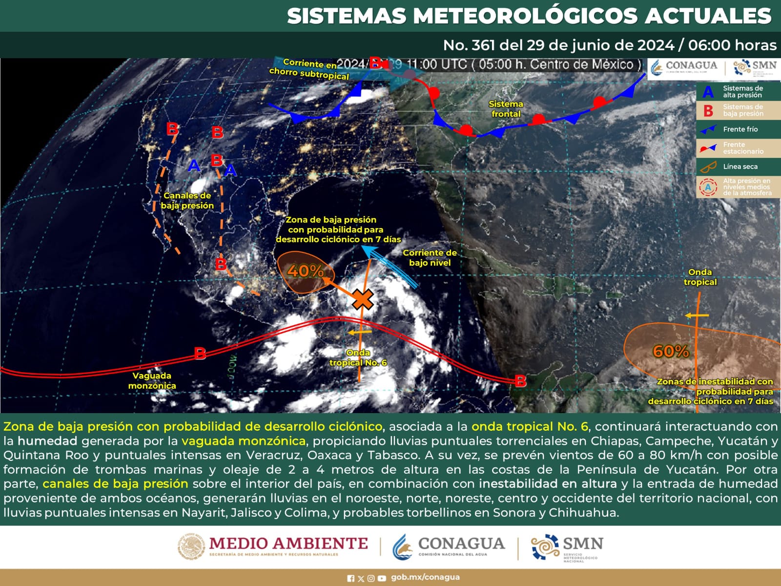 Estas condiciones meteorológicas podrían provocar encharcamientos, inundaciones y deslaves, incremento en los niveles de ríos y arroyos, así como caídas de árboles y anuncios. Se recomienda a la población mantenerse informada y seguir las indicaciones de las autoridades.