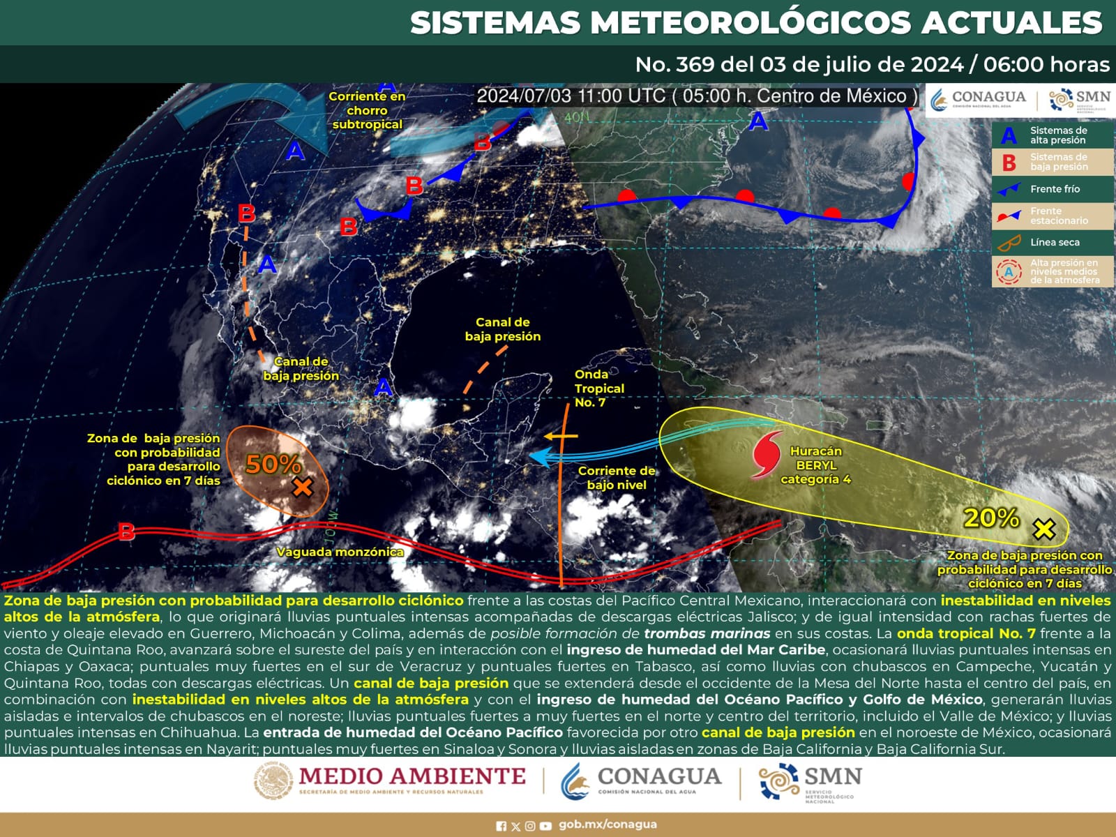 La trayectoria actual de este huracán puede afectar áreas del sureste de Coahuila. Se prevé que, a partir del domingo por la noche y el lunes 8 de julio, la nubosidad asociada a Beryl genere lluvias en el estado.