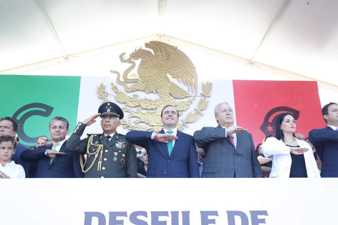 Desde el templete instalado frente al Ateneo Fuente, en el cruce del bulevar Venustiano Carranza y avenida Universidad, Manolo Jiménez observó y saludó a su paso a todos los participantes en este desfile cívico militar.