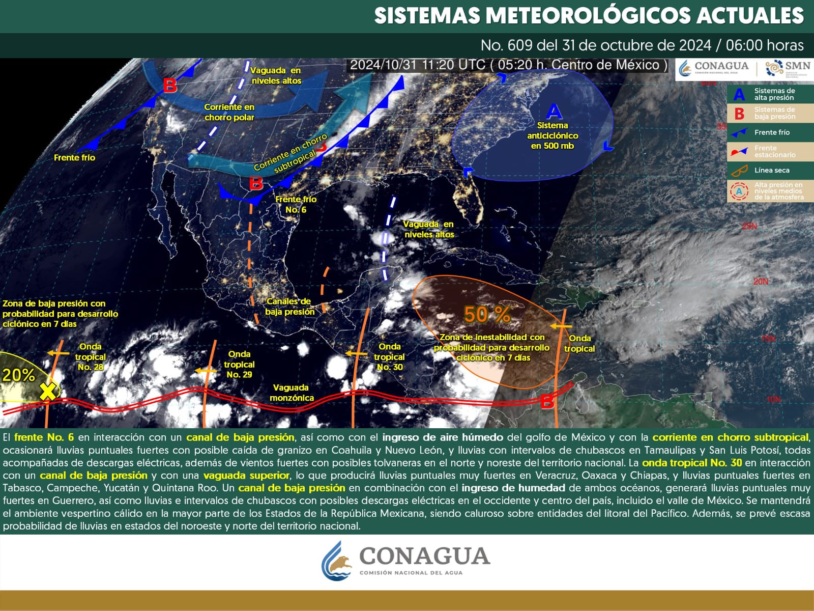 Saltillo, Coahuila de Zaragoza; 31 de octubre de 2024.- La Subsecretaría de Protección Civil del Estado informa que este jueves, el Frente Frío N° 6 se mantendrá estacionario en el norte de Coahuila, generando vientos fuertes, así como lluvias y chubascos vespertinos y nocturnos, acompañados de descargas. electricos y posible granizo.
