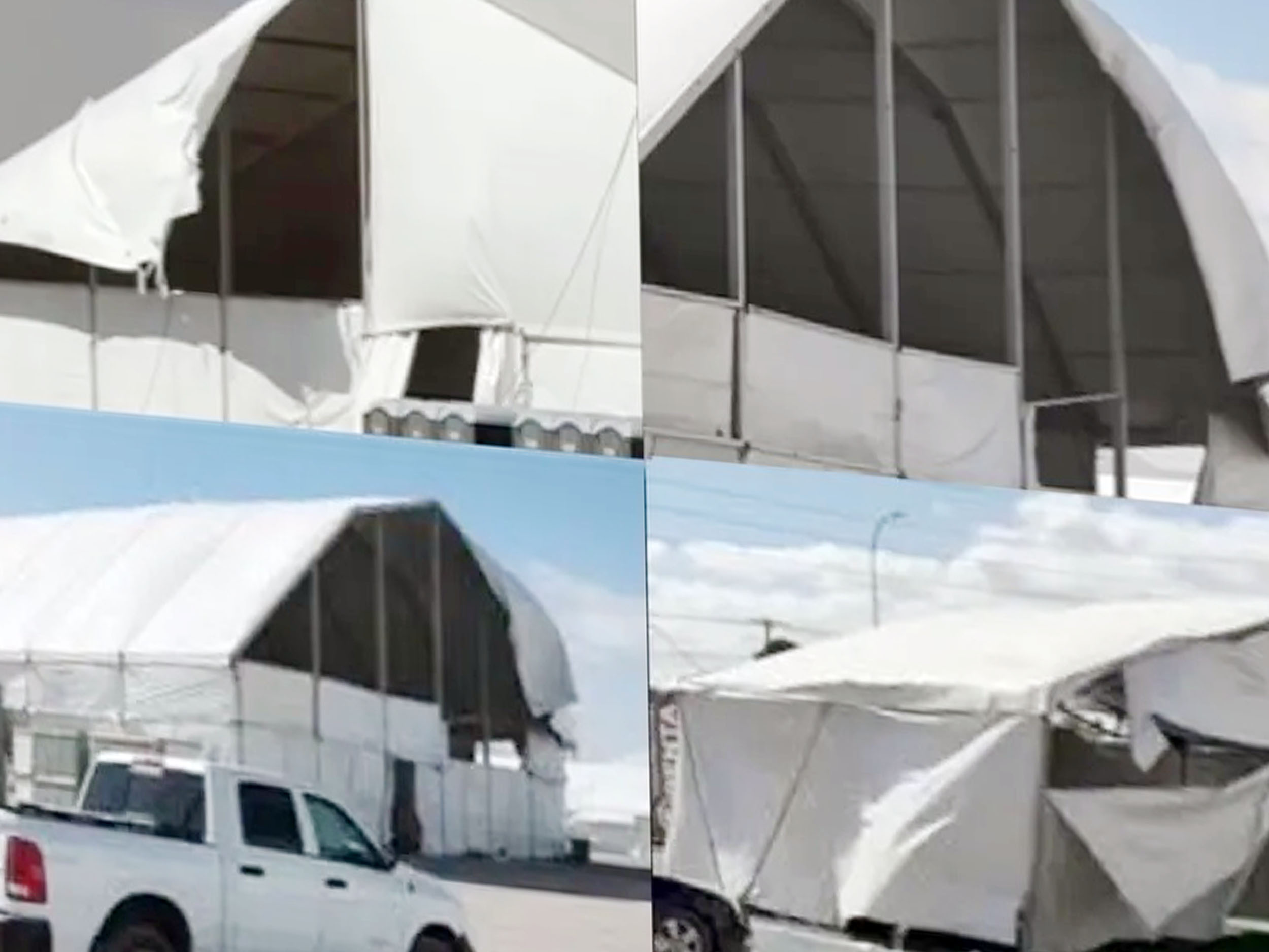 Los fuertes vientos registrados en Chihuahua rasgaron algunas lonas de techos y paredes de los mega campamentos para migrantes instalados en El Punto, en Ciudad Juárez, que servirán para recibir a los miles de migrantes que podrían ser deportados por el gobierno de los Estados Unidos.