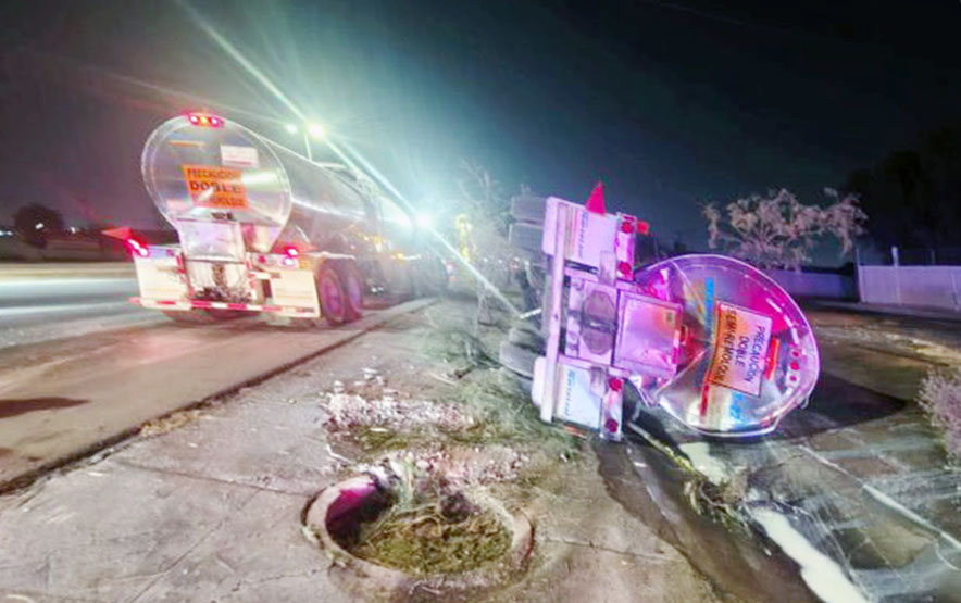 Un remolque cargado de leche volcó en el periférico Raúl López Sánchez durante la madrugada de este jueves, luego de desprenderse del tractocamión que lo arrastraba.