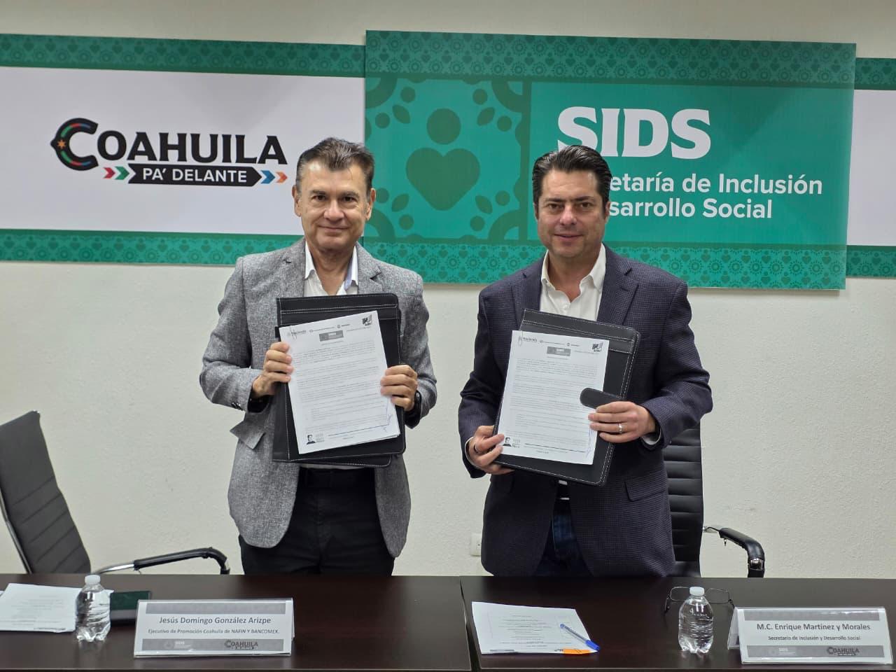Saltillo, Coahuila de Zaragoza; 25 de marzo de 2026.- El Secretario de Inclusión y Desarrollo Social, Enrique Martínez y Morales, encabezó la firma de un convenio de colaboración con Nacional Financiera (NAFIN) y el Banco Nacional de Comercio Exterior (BANCOMEXT), con el propósito de fortalecer las oportunidades de desarrollo económico en el estado mediante el impulso al emprendimiento.