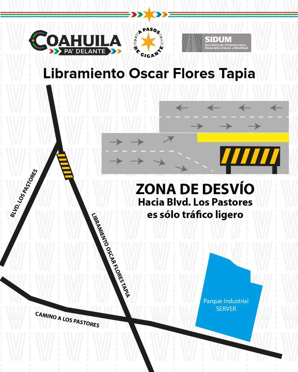 Saltillo, Coahuila: a 19 de septiembre de 2025. La Secretaría de Infraestructura, Desarrollo Urbano y Movilidad informa a la ciudadanía que a partir del domingo 21 de septiembre se implementará un desvío parcial en el tramo que conecta el Libramiento Óscar Flores Tapia y el Blvd. Los Pastores, como parte de la segunda etapa de construcción de este boulevard en la zona norte de Saltillo.
