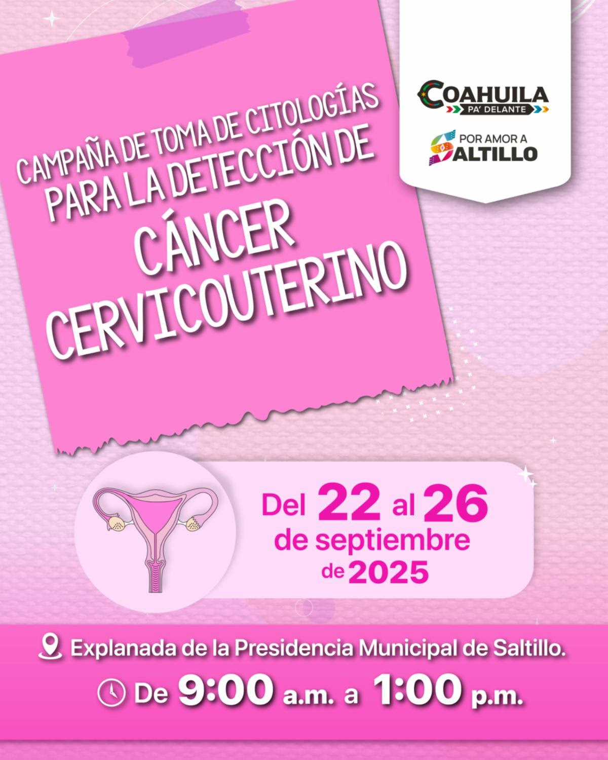 Adicionalmente, la Dirección de Salud Pública Municipal informó que se llevará a cabo una campaña de toma de citologías para detección del cáncer cervicouterino del 22 al 26 de septiembre en la explanada de la Presidencia Municipal de Saltillo.