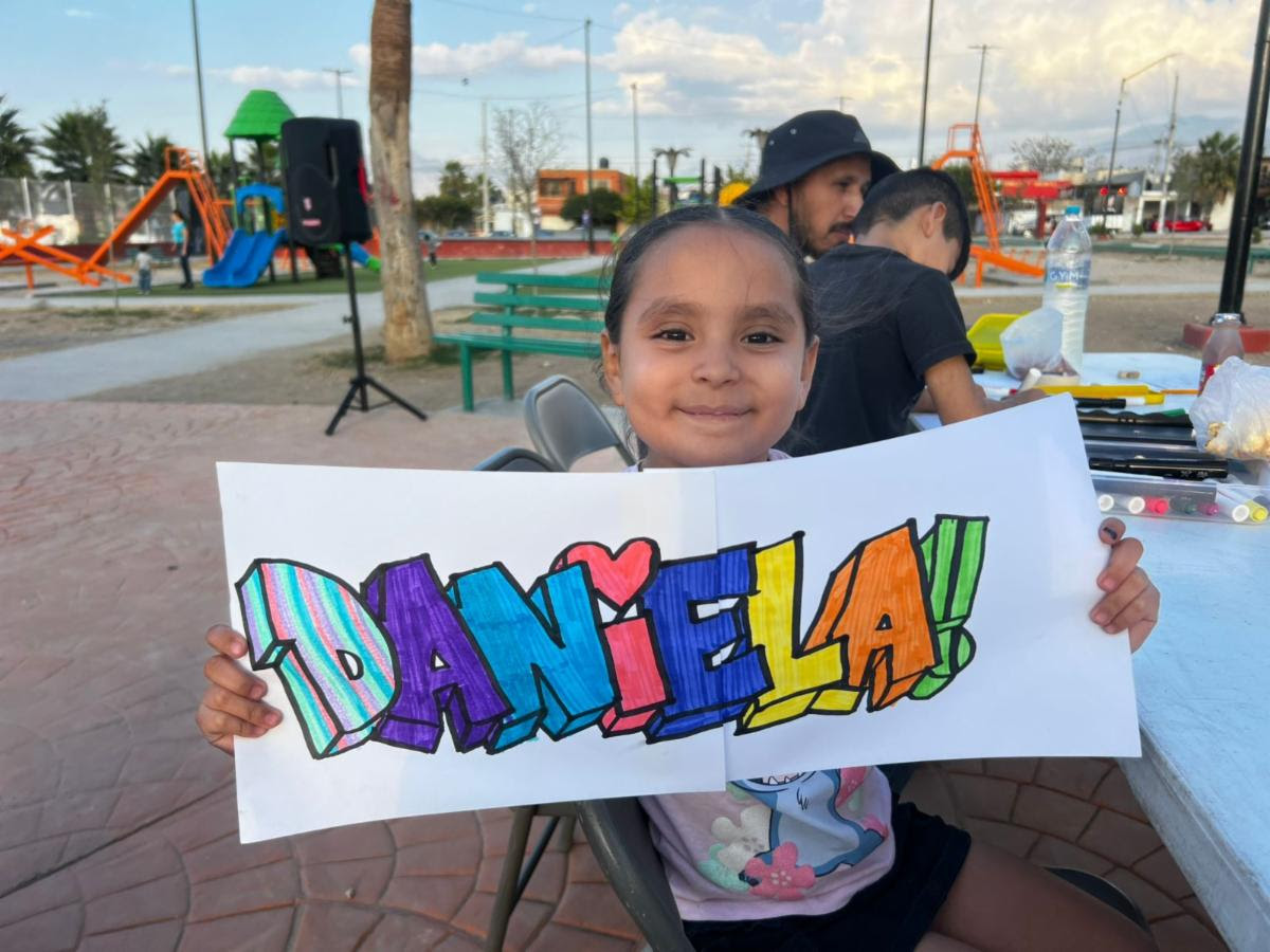 Además, durante La Ruta Más Creativa, las niñas y niños de la colonia Mirasierra y aledañas tuvieron la oportunidad de pintar grafitis con sus nombres en hojas de máquina.