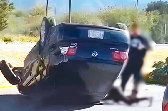 Un aparatoso accidente ocurrió la tarde de este jueves al sur de la ciudad, cuando el conductor de un vehículo Volkswagen perdió el control del volante y terminó volcándose tras derribar dos pinos en el camellón central.