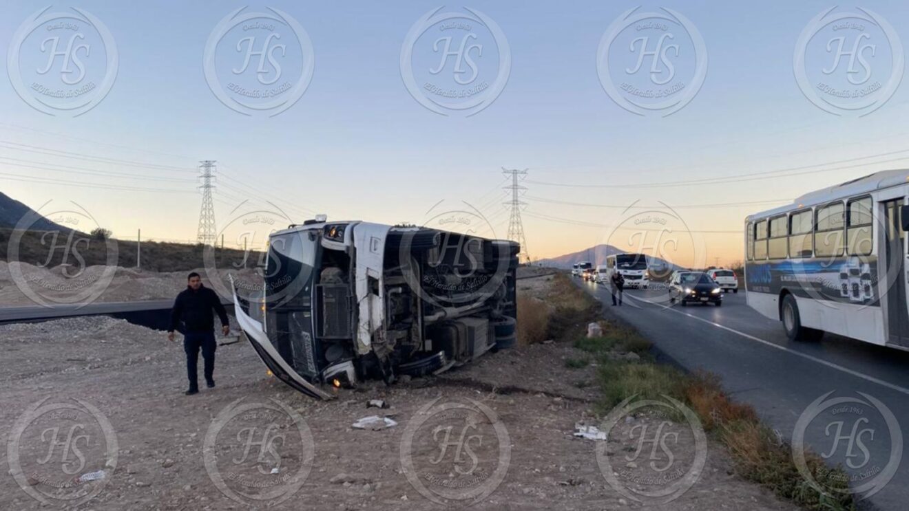 Al menos 20 personas resultaron lesionadas tras la volcadura de un autobús de transporte de personal registrada la mañana de este jueves sobre la carretera a Zacatecas, a la altura del ejido La Angostura.
