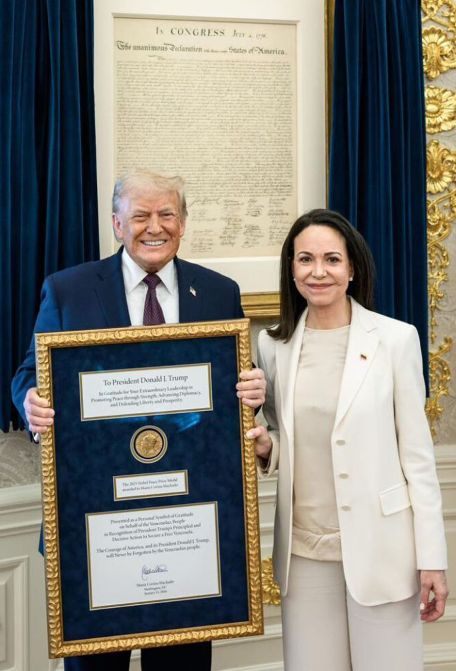 Washington.- La líder de la Oposición venezolana, María Corina Machado, afirmó que le entregó su medalla del Premio Nobel de la Paz al presidente Donald Trump, durante su reunión en la Casa Blanca, por su compromiso único con la libertad del pueblo de Venezuela.